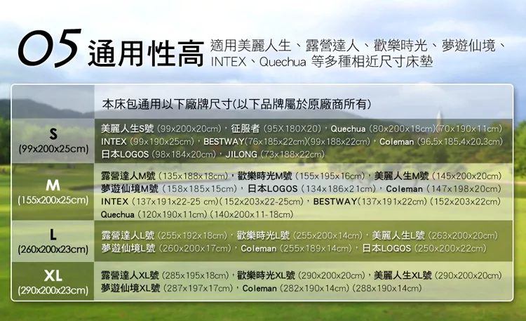 ◆通用性:適用美麗人生、露營達人、歡樂時光、夢遊仙境、INTEX、Quechua、征服者、BESTWAY、Coleman、日本LOGOS等相近尺寸床墊