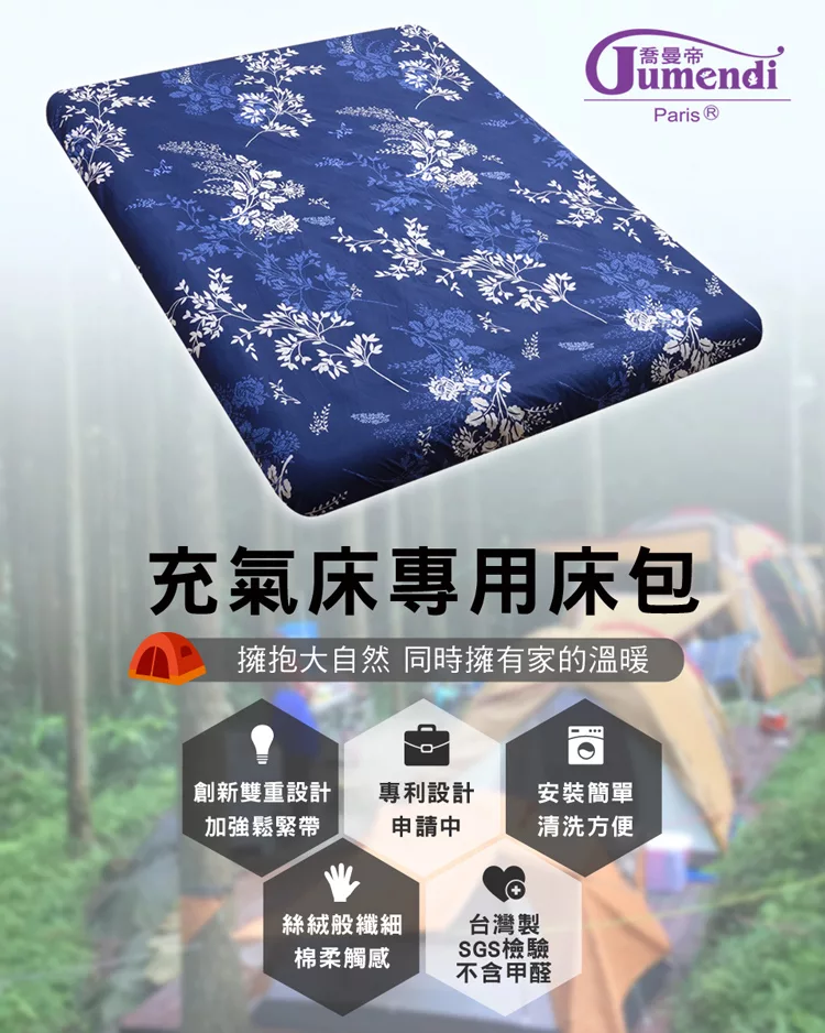 本系列充氣床墊專用包覆式床包,採用質地細緻、柔順透氣、觸感極佳的柔絲絨布料,特選印花款式,造型經典時尚,輔以高級車工裁縫,四角再加強寬版鬆緊帶,使床包與充氣床墊床面更平坦服貼,讓您在外露營也能享受如家中臥室般的舒適感。